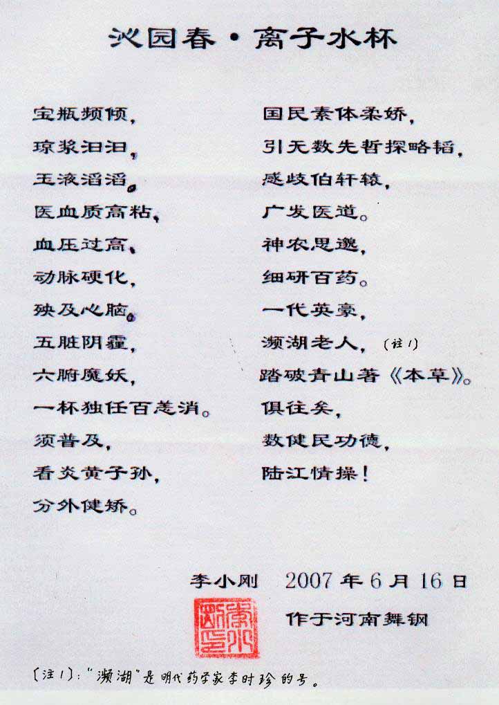 -----我是從事建筑的高工,本來沒有資格去攻克醫(yī)學(xué)難題,卻為了自身健康才扣響醫(yī)學(xué)的大門。由于我1990年患高血壓,因怕中風(fēng)才研究發(fā)明了離子水瓶,我把水處理成微小分子團(tuán)水,飲用后治愈了高血壓。便于1993年底送到三家省級(jí)醫(yī)院做臨床試用4個(gè)月。經(jīng)北京和廣西醫(yī)學(xué)專家鑒定:"降脂降壓效果好"," 能擴(kuò)大心腦動(dòng)脈流量,改善心腦電圖以及微循環(huán)","對(duì)治療心腦動(dòng)脈粥樣硬化、高血壓、高血脂有良好的醫(yī)療保健作用。""產(chǎn)品的技術(shù)性能和療效達(dá)到了同類產(chǎn)品的國內(nèi)領(lǐng)先水平,經(jīng)廣西醫(yī)學(xué)科學(xué)情報(bào)研究所檢索,未見國外有類似報(bào)道。"中國醫(yī)學(xué)科學(xué)院張正國教授從美國國立醫(yī)學(xué)圖書館數(shù)據(jù)庫存Medline檢索英俄文資料,均未見類似報(bào)告。2000年上市后,我為了對(duì)消費(fèi)者負(fù)責(zé)而繼續(xù)觀察研究,一直通過《信譽(yù)卡》和《質(zhì)量跟蹤調(diào)查書》向患者承諾療效,請(qǐng)用戶使用6個(gè)月后反饋效果。和脂壓患者飲用2至5個(gè)月內(nèi),消除癥狀,停服藥物,血壓正常;冠心病患者飲用3~5個(gè)月逐漸減輕至消除心絞痛、房顫等癥狀,不再服藥,飲用1年左右心電圖正常,經(jīng)冠脈造影掃描無明顯狹窄,表明冠心病痊愈。大量患者還反映許多衰弱器官被修復(fù),讓前列腺增生、慢性咽喉炎、慢性氣管炎、支氣管炎、慢性胃炎、腸炎和膽囊炎等不藥而愈;2型糖尿病患者是因?yàn)橐葝u衰弱致病,飲用該水半年至一年,逐漸減藥至停藥,血糖尿糖正常,真正治愈2型糖尿病。中風(fēng)后遺癥患者飲用六七個(gè)月,可逐漸減輕至消除肢體和語言障礙,表明飲用該水能讓壽命很長(zhǎng)的神經(jīng)元細(xì)胞逐漸修復(fù),奇跡般地恢復(fù)肢體和語言功能。飲用后還使胸腺和脾臟兩個(gè)重要的免疫器官被修復(fù)和增強(qiáng),產(chǎn)生免疫細(xì)胞多,提高了免疫力,使人不生病或少生病。自此, 飲用微小分子團(tuán)水創(chuàng)造了攻克冠心病、高(低)血壓和糖尿病三大醫(yī)學(xué)難題的奇跡。人們對(duì)此感到不可思議,但實(shí)踐是檢驗(yàn)真理的唯一標(biāo)準(zhǔn)。